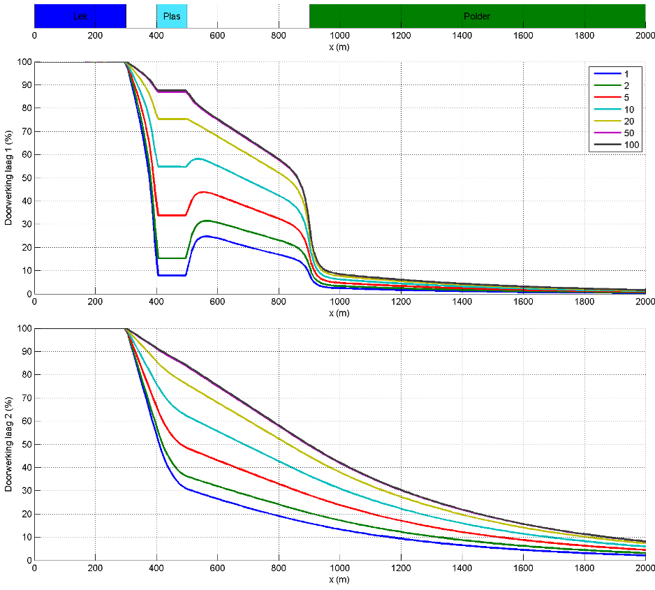 Door middel van een 2d-modellering is aangetoond dat deze eigenschappen met een vereenvoudigd model ook aan te tonen zijn: door de grote waterberging in het oppervlaktewater reageert het peil hiervan vertraagt op peilveranderingen van de Lek. Met het 2d-model is de snelheid van de reactie van het diepe grondwater op grotere afstand van de Lek echter niet goed te verklaren.